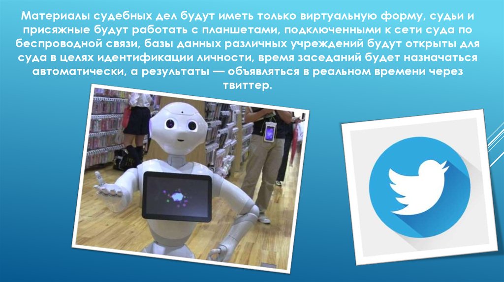 В будущем некоторые категории дел в будущем может рассматриватькомпьютер, поскольку современные технологии обработки информации,