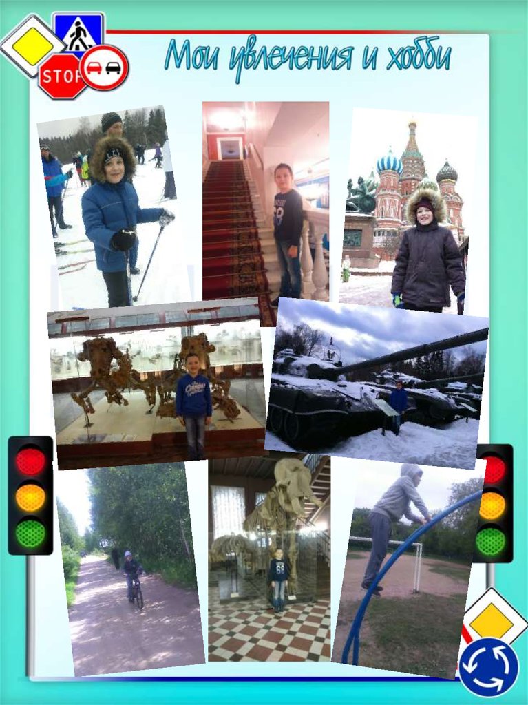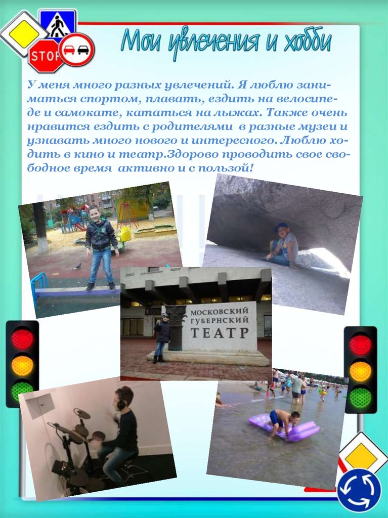 У меня много разных увлечений. Я люблю заниматься спортом, плавать, ездить на велосипеде и самокате, кататься на лыжах. Также оченьнравится ездить с родителями в разные музеи и