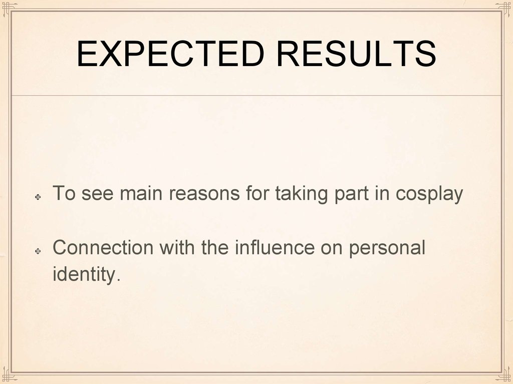 EXPECTED RESULTSTo see main reasons for taking part in cosplay