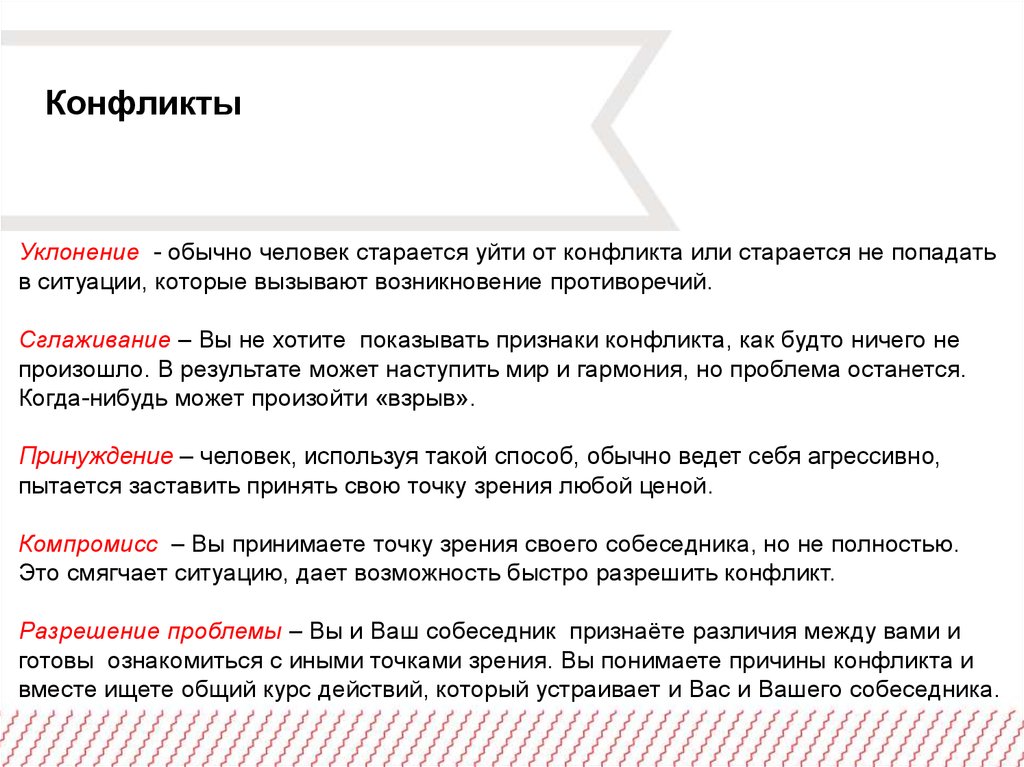 КонфликтыУклонение - обычно человек старается уйти от конфликта или старается не попадать