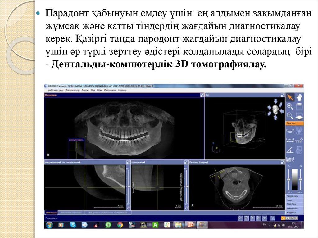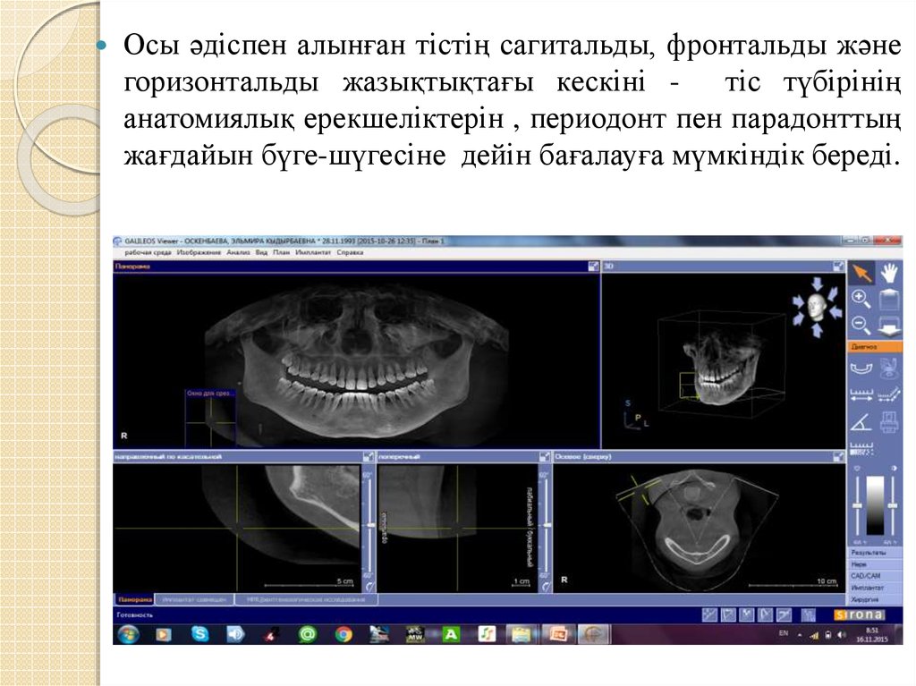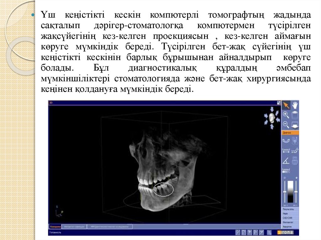 Үш кеңістікті кескін компютерлі томографтың жадындасақталып дәрігер-стоматологқа компютермен түсірілген
