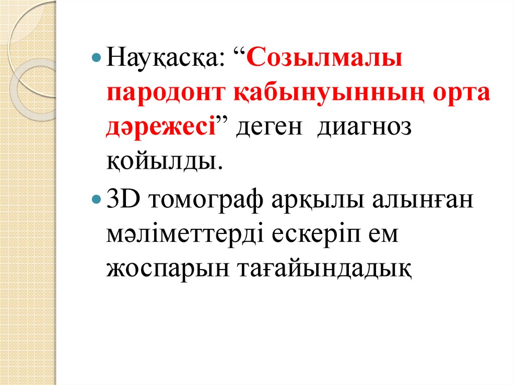 Зерттеу барысында науқастың 3.4 , 3.5 тістерінің түбірмаңындағы сүйек тінінің сорылуын байқадық. Сонымен