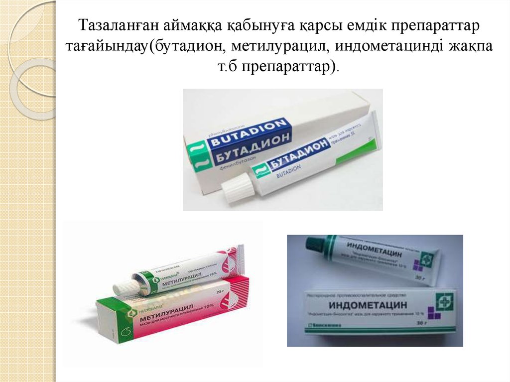 Тазаланған аймаққа қабынуға қарсы емдік препараттартағайындау(бутадион, метилурацил, индометацинді жақпа