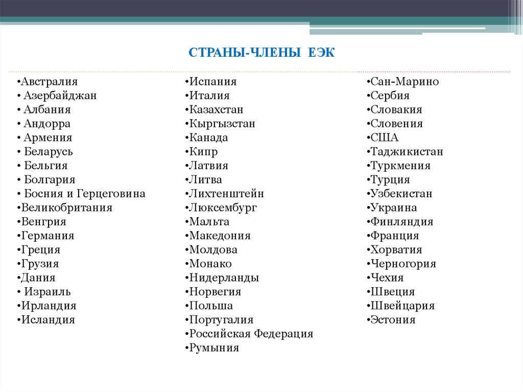 Цели ЕЭК: - содействие развитию и укреплению экономических отношений