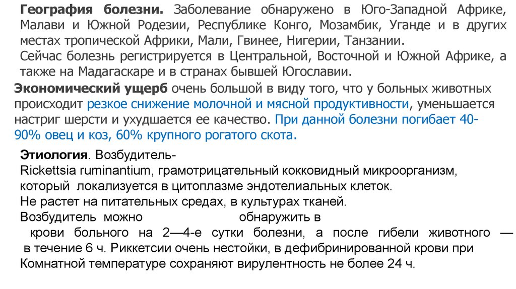 Этиология. ВозбудительRickettsia ruminantium, грамотрицательный кокковидный микроорганизм,