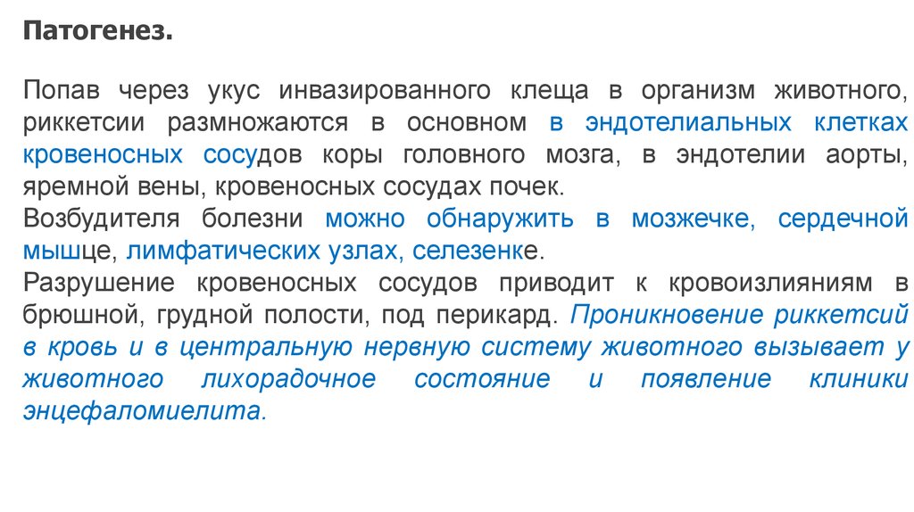 Патогенез.Попав через укус инвазированного клеща в организм животного,