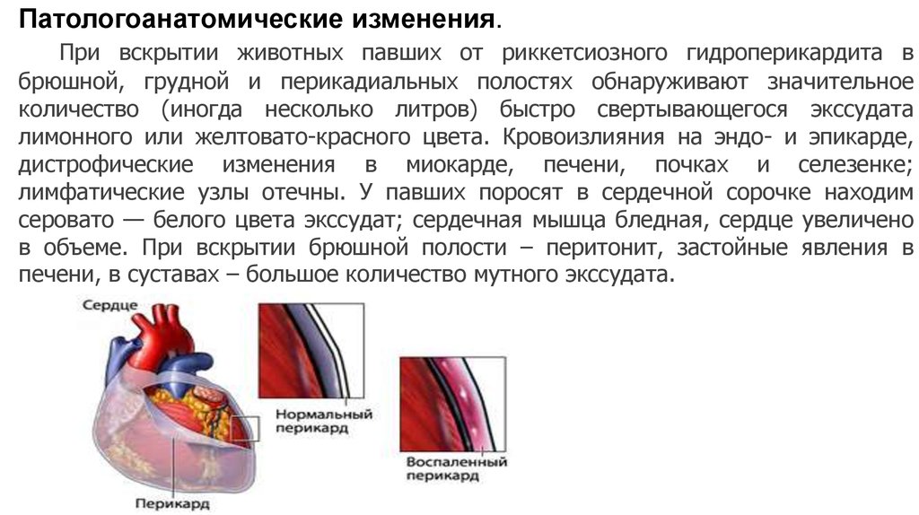 Патологоанатомические изменения.При вскрытии животных павших от риккетсиозного гидроперикардита в