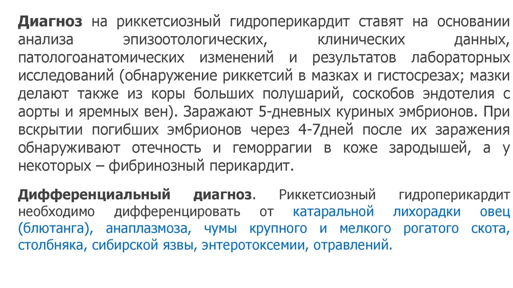 Диагноз на риккетсиозный гидроперикардит ставят на основаниианализа