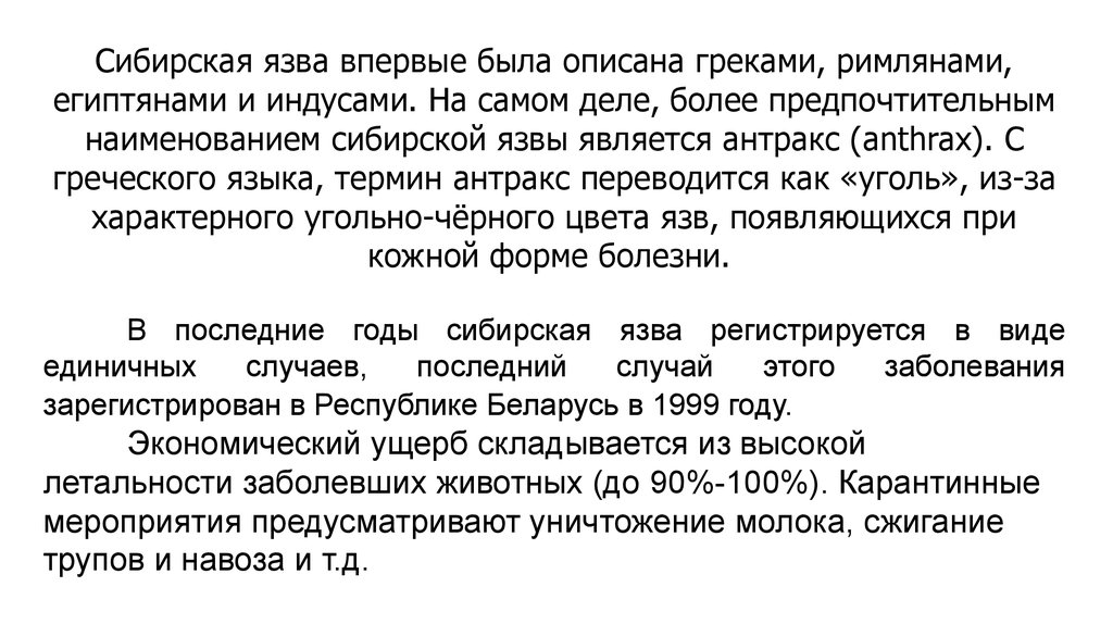 Сибирская язва впервые была описана греками, римлянами,египтянами и индусами. На самом деле, более предпочтительным