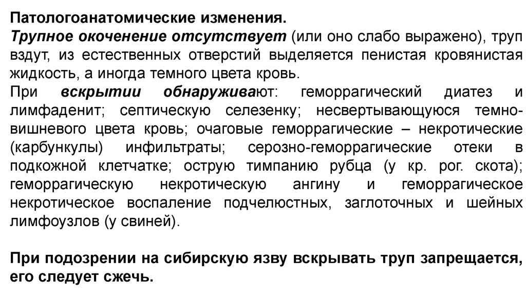 лимфаденит; септическую селезенку; несвертывающуюся темновишневого цвета кровь; очаговые геморрагические – некротические