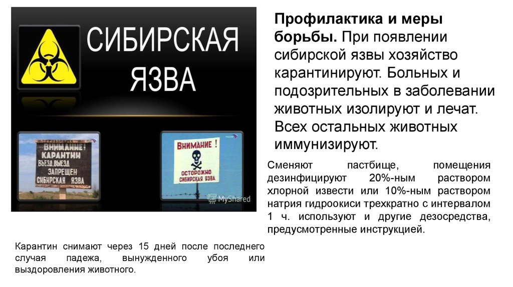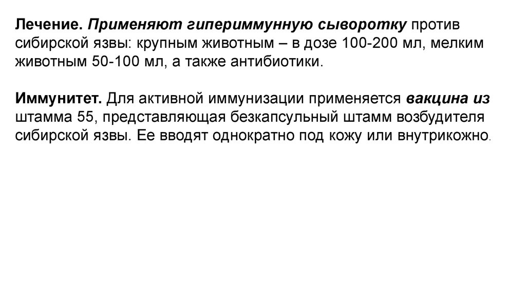 Лечение. Применяют гипериммунную сыворотку противсибирской язвы: крупным животным – в дозе 100-200 мл, мелким