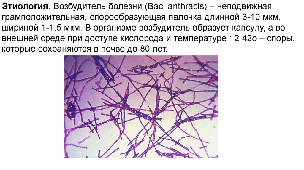 Этиология. Возбудитель болезни (Bac. anthracis) – неподвижная,грамположительная, спорообразующая палочка длинной 3-10 мкм,