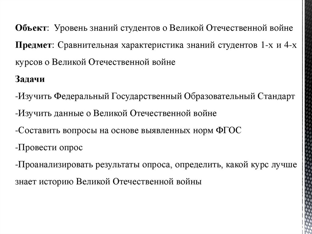Объект: Уровень знаний студентов о Великой Отечественной войнеПредмет: Сравнительная характеристика знаний студентов 1-х и 4-х