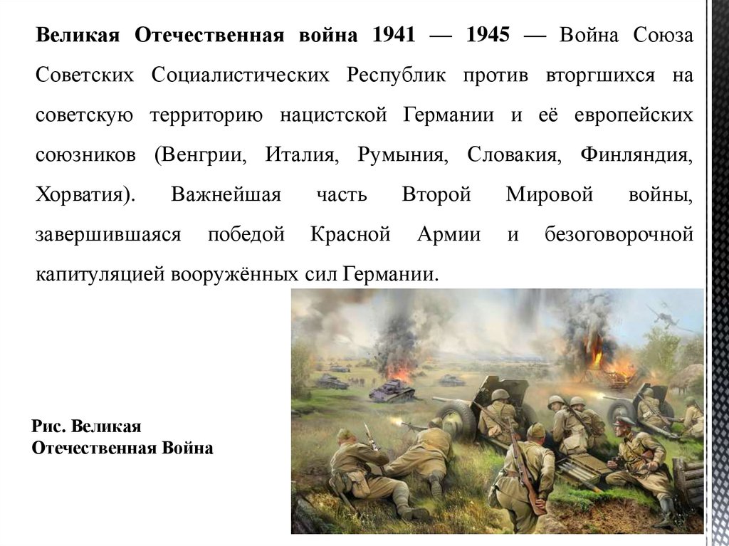 Великая Отечественная война 1941 — 1945 — Война СоюзаСоветских Социалистических Республик против вторгшихся на