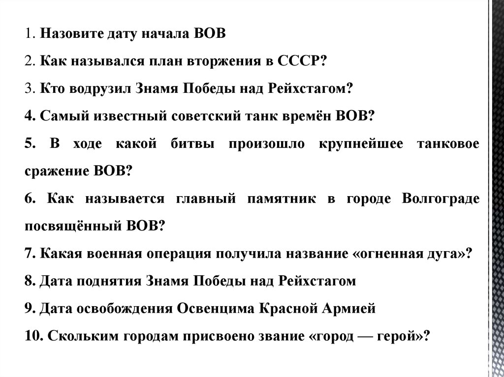 1. Назовите дату начала ВОВ2. Как назывался план вторжения в СССР?