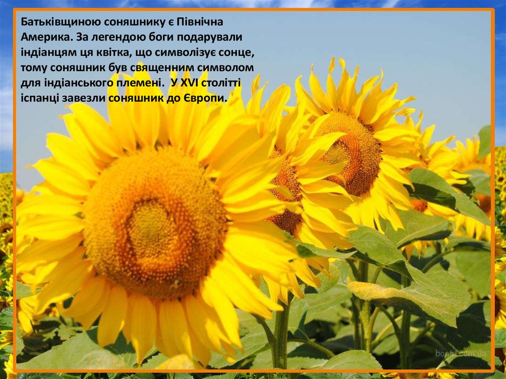 Батьківщиною соняшнику є ПівнічнаАмерика. За легендою боги подарували