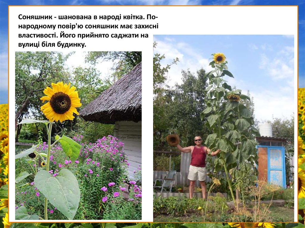 Соняшник - шанована в народі квітка. Понародному повір'ю соняшник має захиснівластивості. Його прийнято саджати на