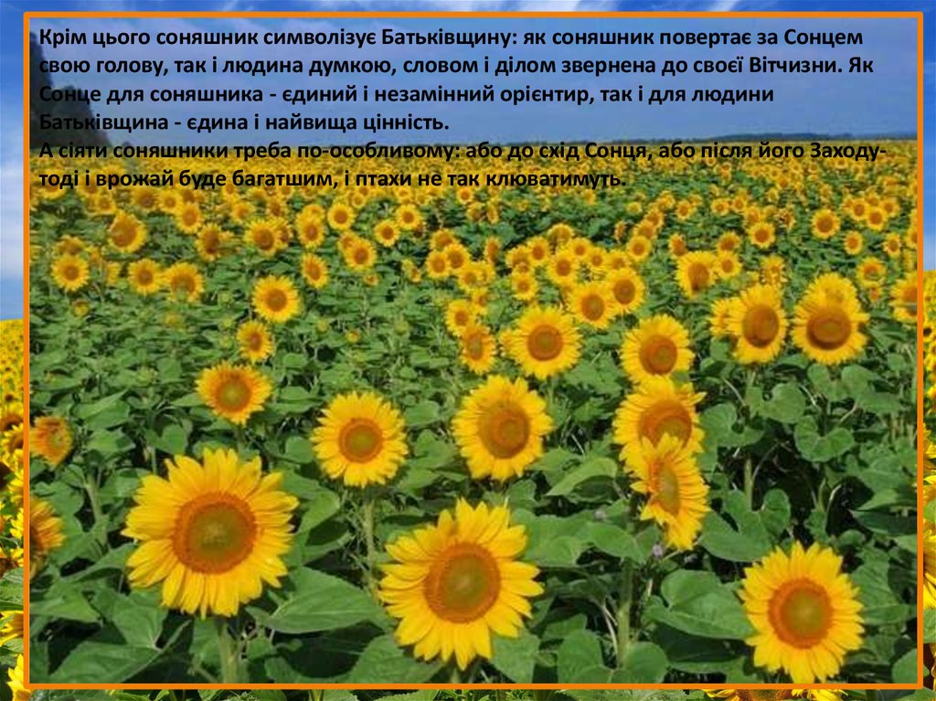 Крім цього соняшник символізує Батьківщину: як соняшник повертає за Сонцемсвою голову, так і людина думкою, словом і ділом звернена до своєї Вітчизни. Як