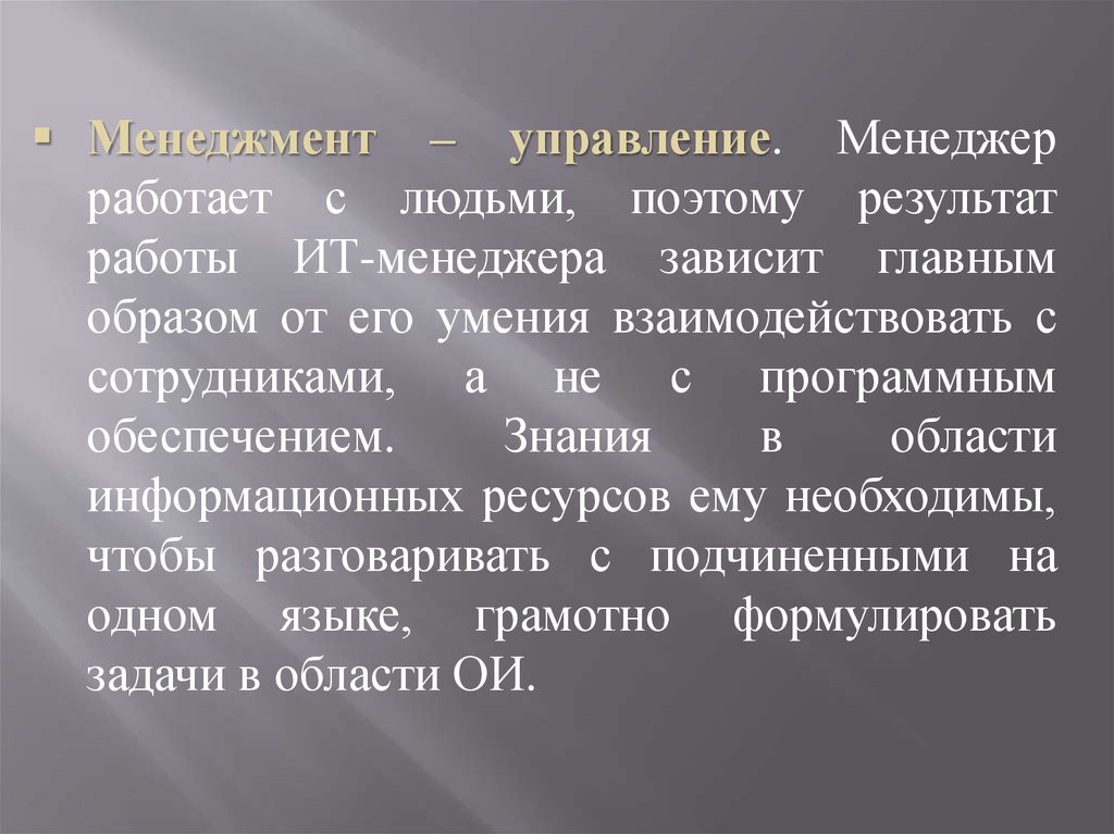 Менеджмент – управление. Менеджерработает с людьми, поэтому результат