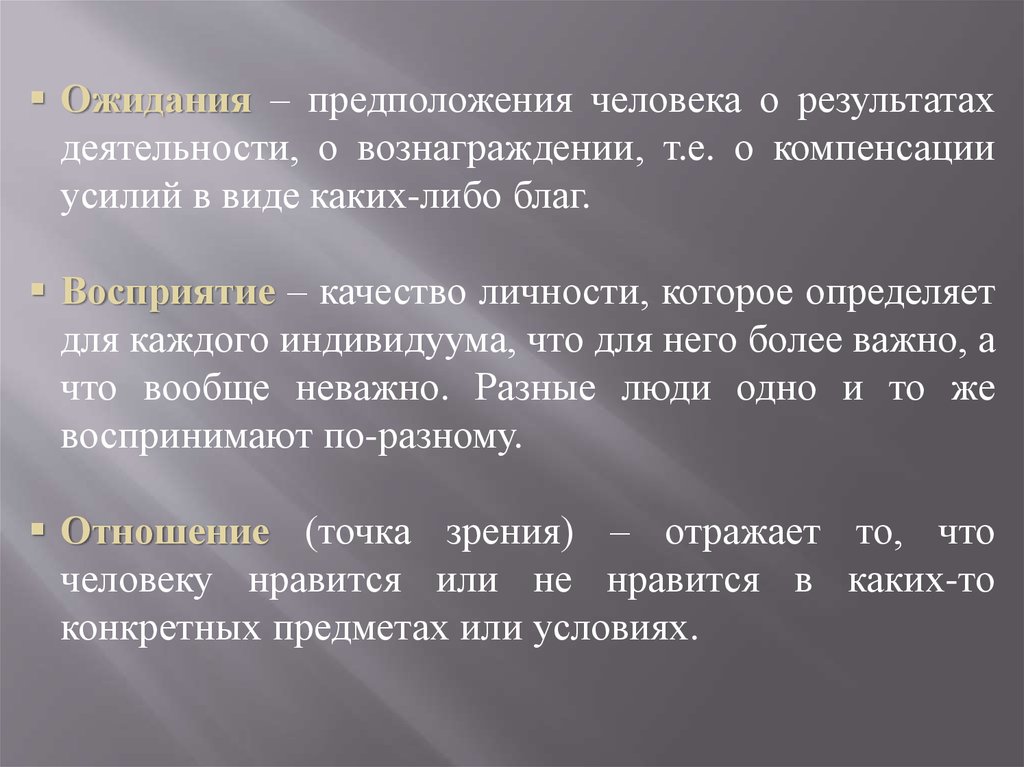 Ожидания – предположения человека о результатахдеятельности, о вознаграждении, т.е. о компенсации