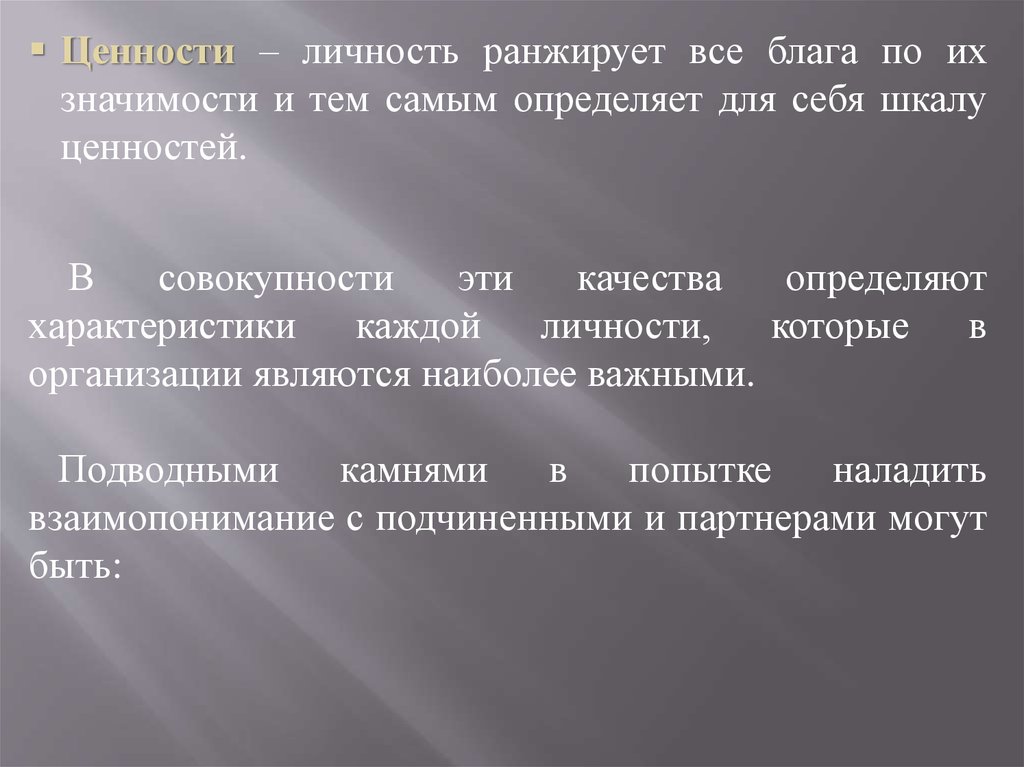 Ценности – личность ранжирует все блага по ихзначимости и тем самым определяет для себя шкалу