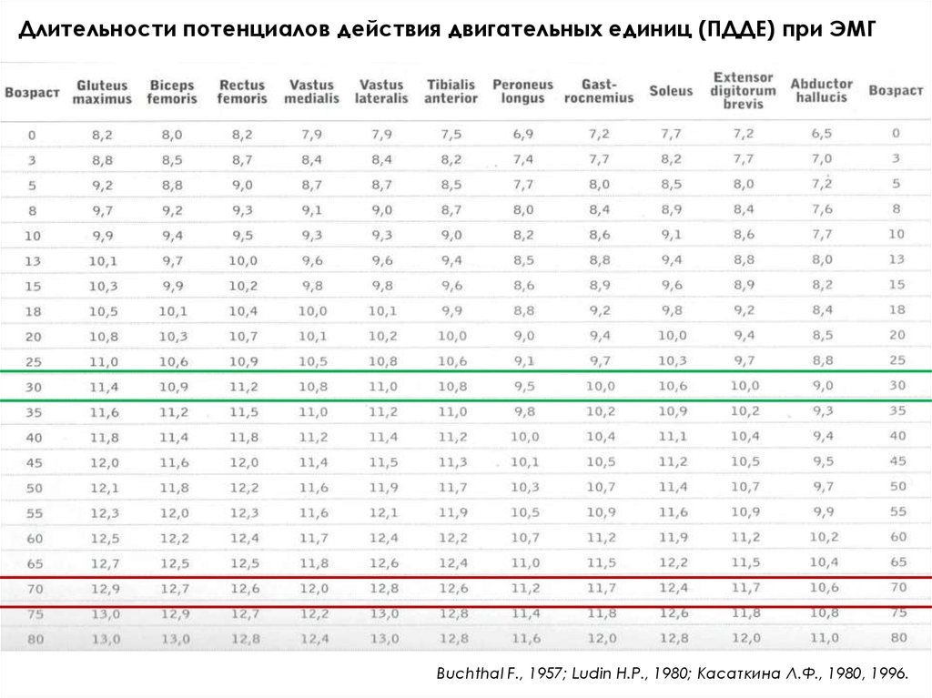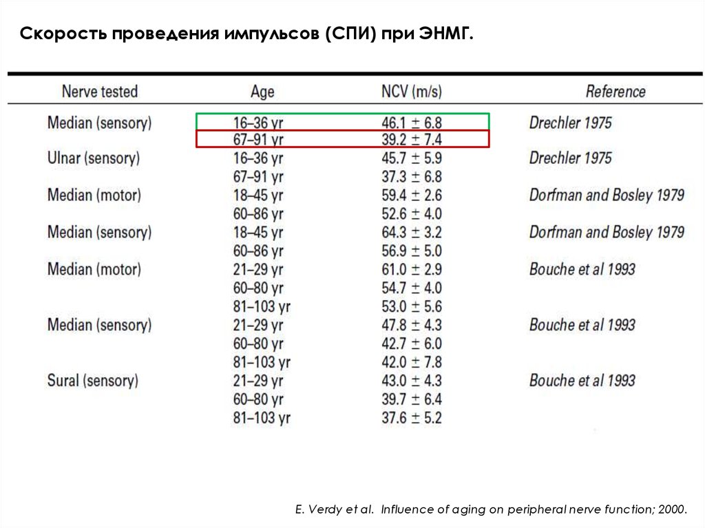 Скорость проведения импульсов (СПИ) при ЭНМГ.E. Verdy et al. Influence of aging on peripheral nerve function; 2000.