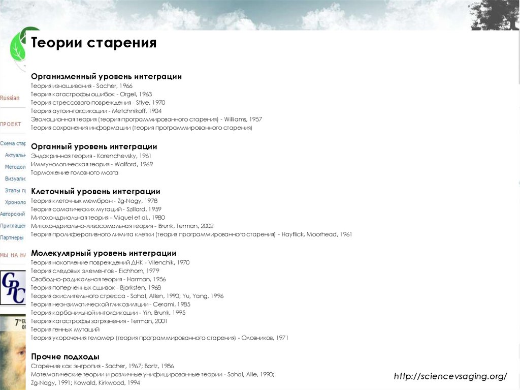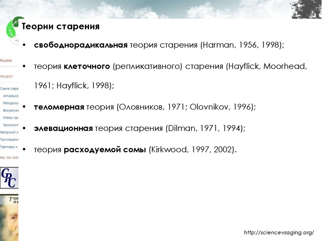 • теория клеточного (репликативного) старения (Hayflick, Moorhead,