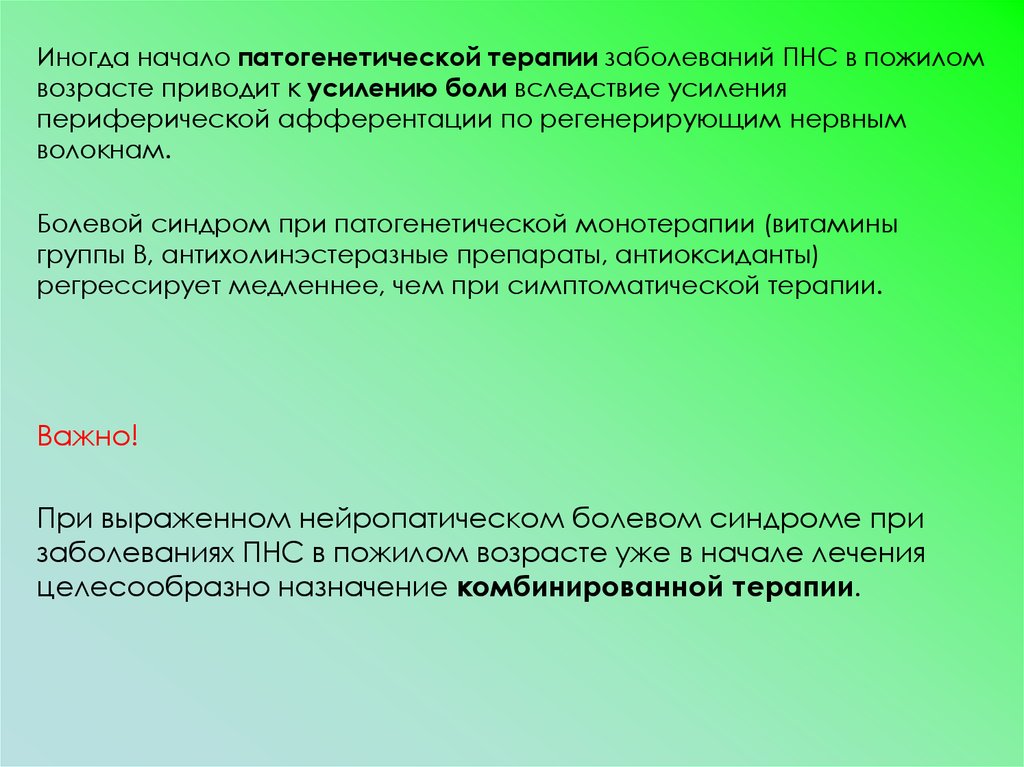 Иногда начало патогенетической терапии заболеваний ПНС в пожиломвозрасте приводит к усилению боли вследствие усиления