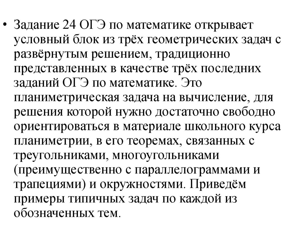 • Задание 24 ОГЭ по математике открываетусловный блок из трёх геометрических задач с