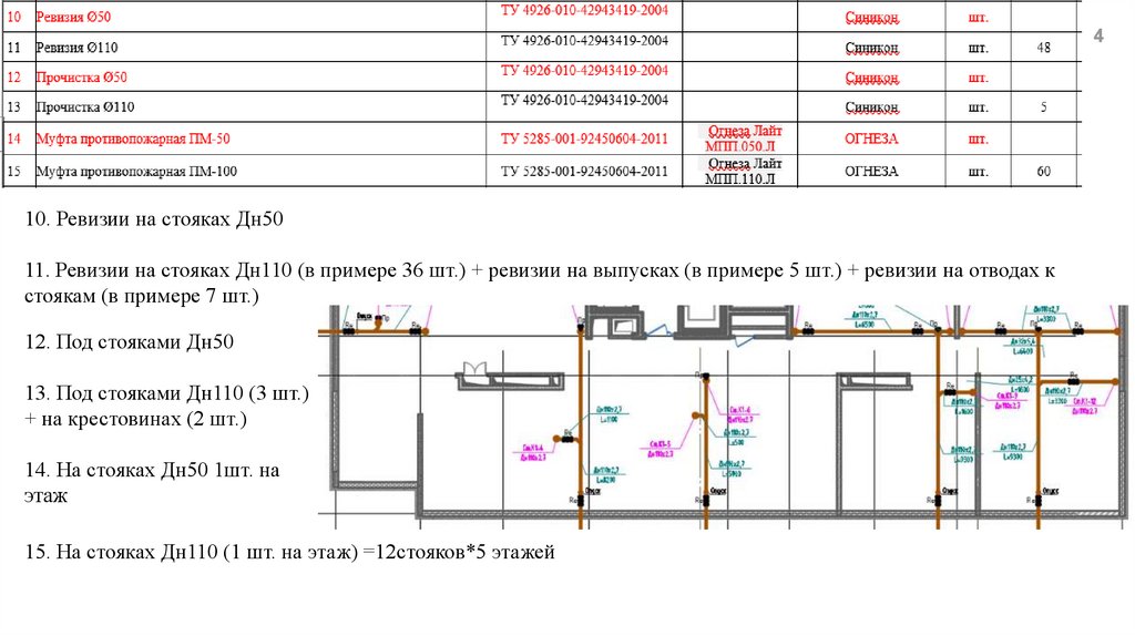 11. Ревизии на стояках Дн110 (в примере 36 шт.) + ревизии на выпусках (в примере 5 шт.) + ревизии на отводах к