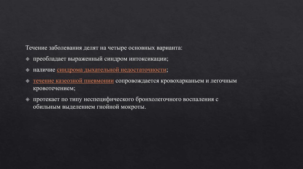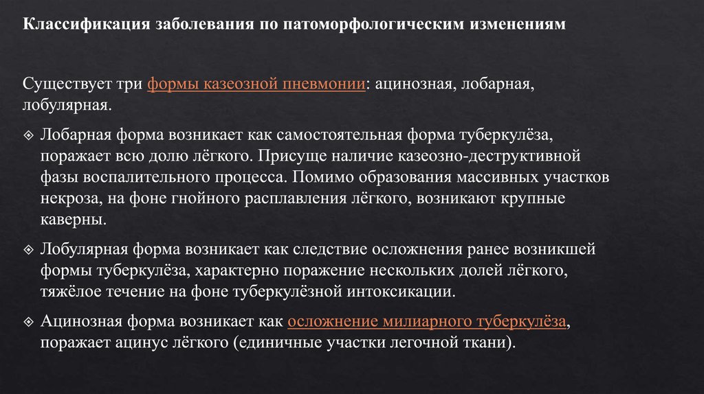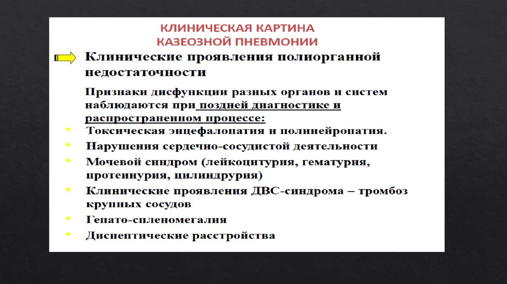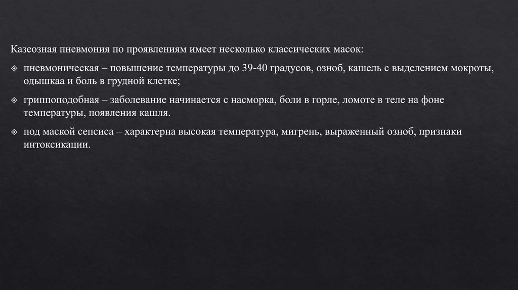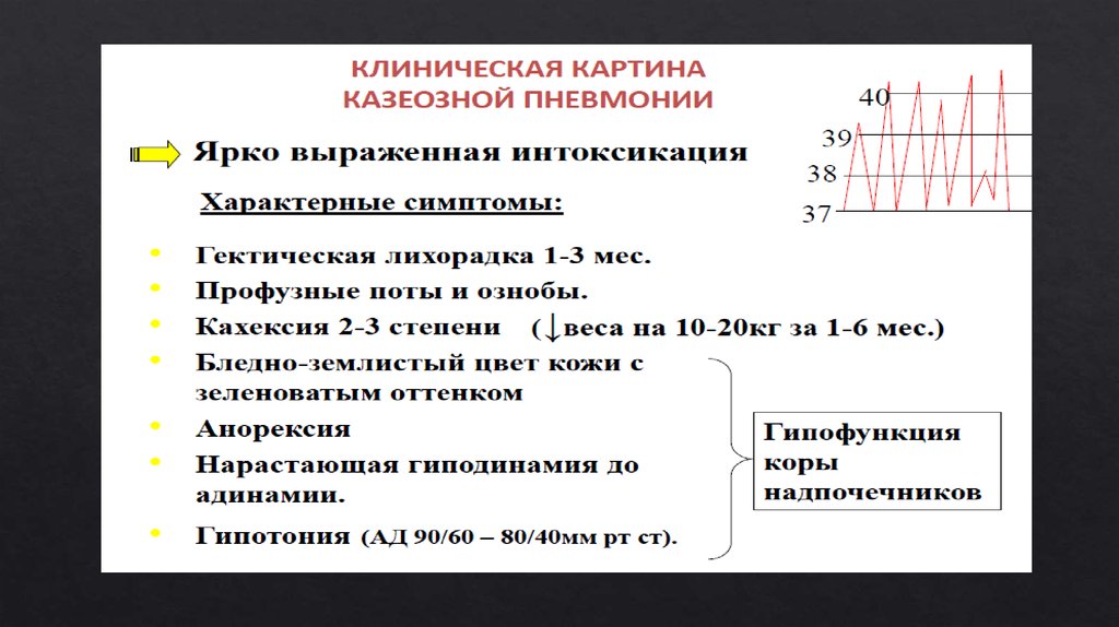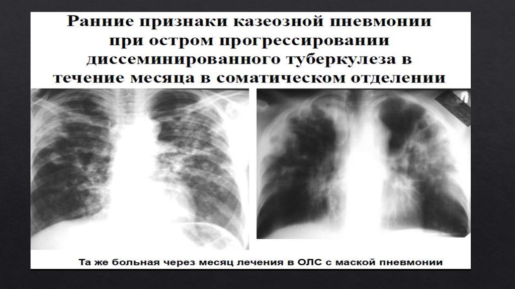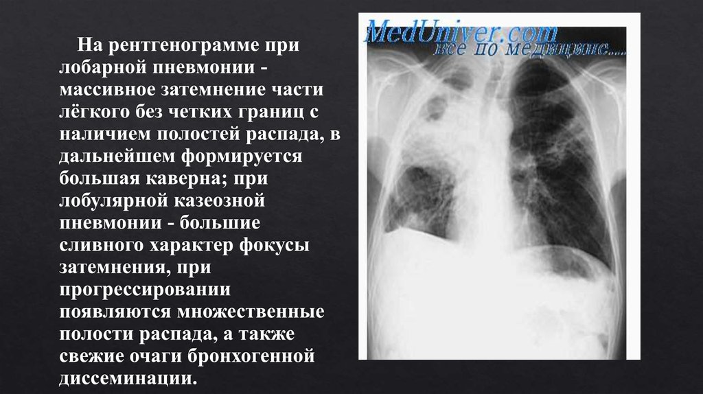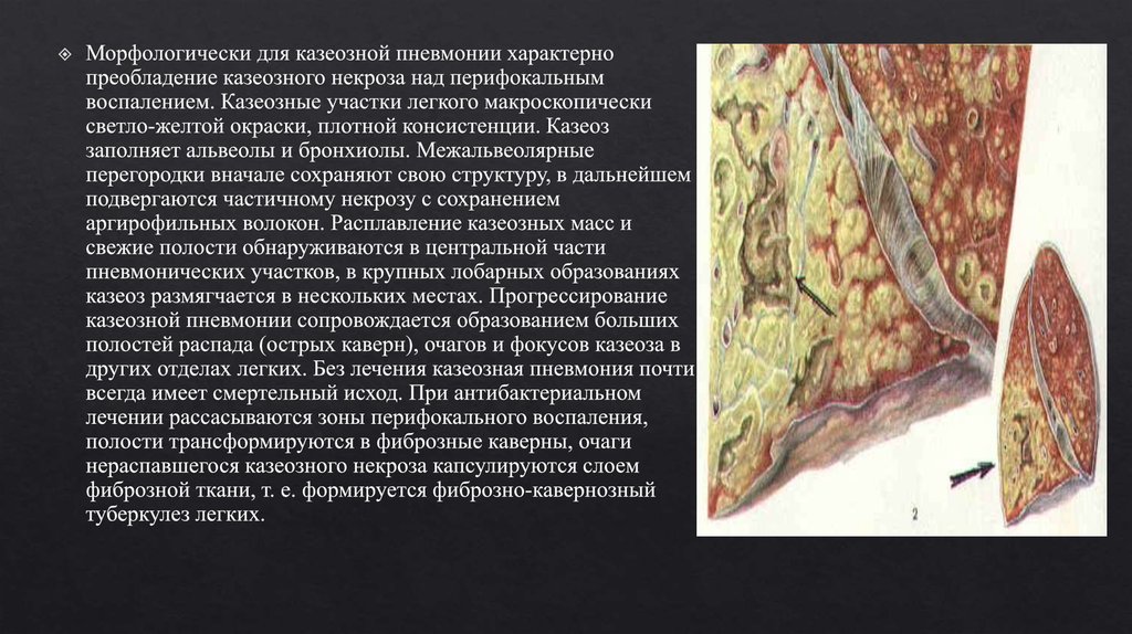 Возникновение казеозной пневмонии связано с интенсивным размножением МБТ в легочной ткани,которое происходит на фоне выраженного иммунодефицита. Характерным признаком