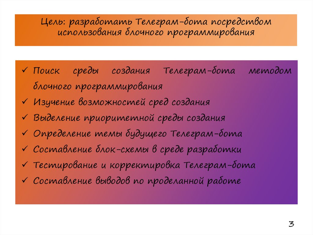 Цель: разработать Телеграм-бота посредствомиспользования блочного программирования
