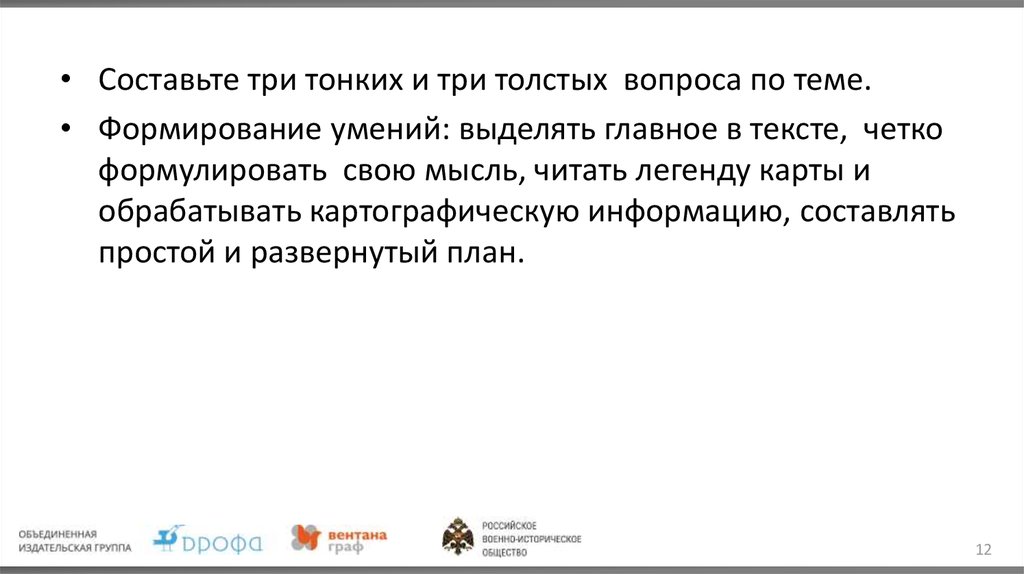 • Составьте три тонких и три толстых вопроса по теме.• Формирование умений: выделять главное в тексте, четко
