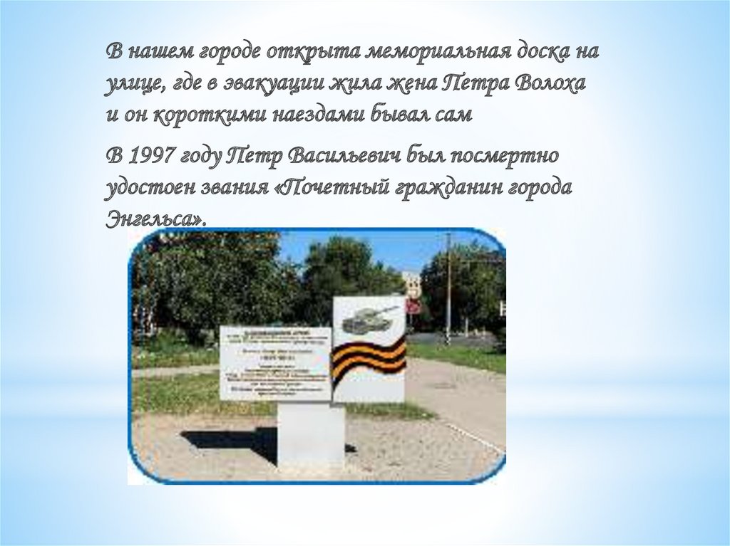 В нашем городе открыта мемориальная доска наулице, где в эвакуации жила жена Петра Волоха