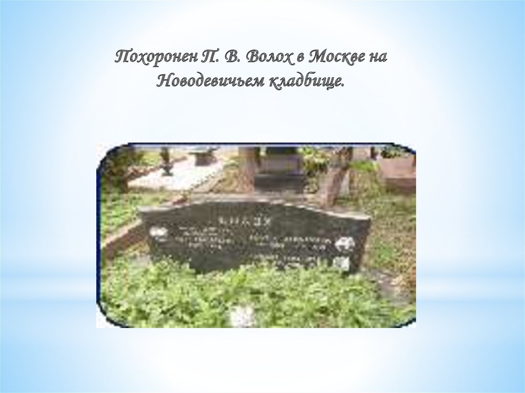 Похоронен П. В. Волох в Москве наНоводевичьем кладбище.
