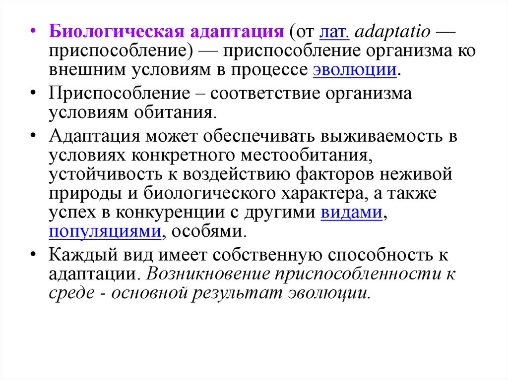• Биологическая адаптация (от лат. adaptatio —приспособление) — приспособление организма ко