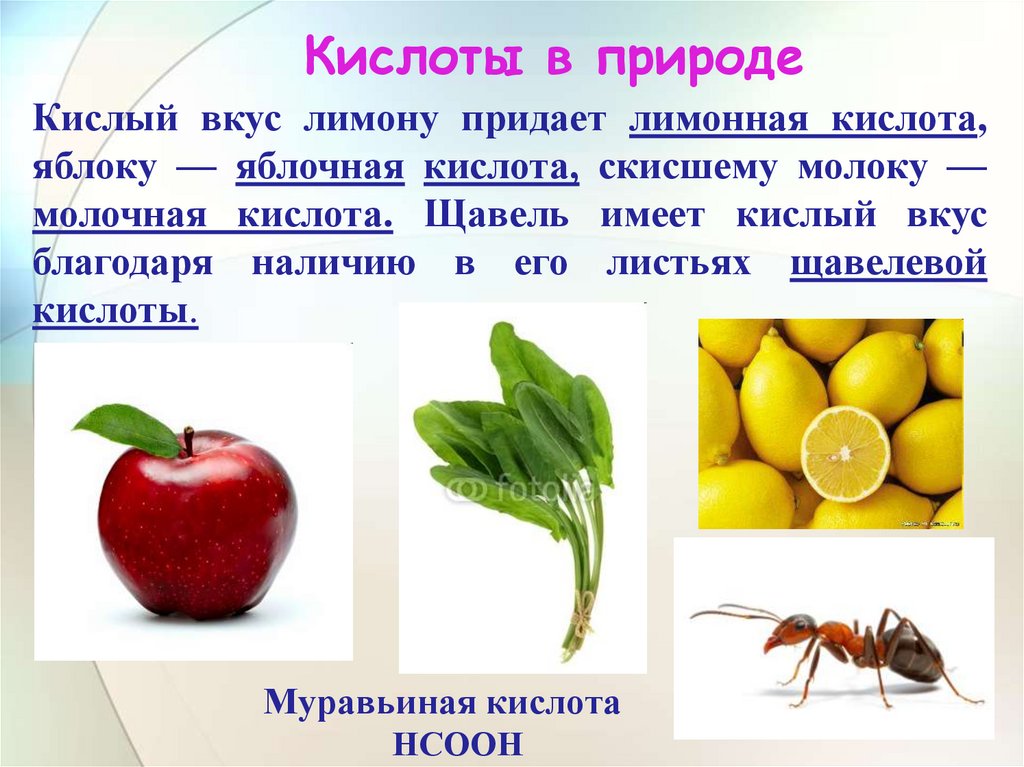 Кислоты в природеКислый вкус лимону придает лимонная кислота,