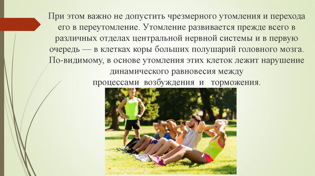 При этом важно не допустить чрезмерного утомления и переходаего в переутомление. Утомление развивается прежде всего в