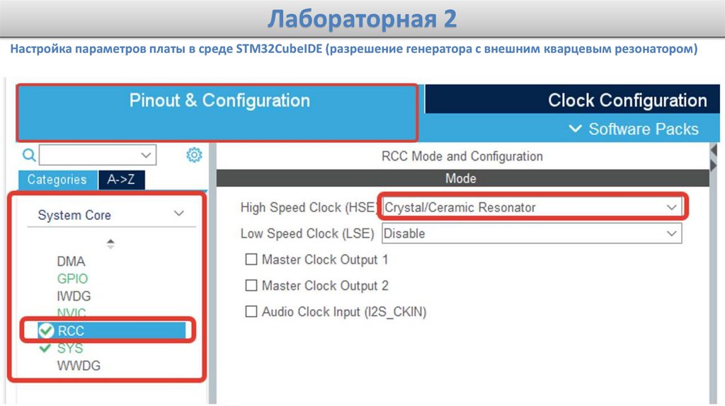 Лабораторная 2Настройка параметров платы в среде STM32CubeIDE (разрешение генератора с внешним кварцевым резонатором)