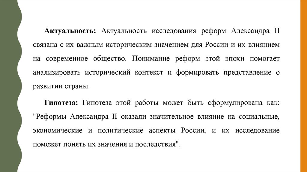 Актуальность: Актуальность исследования реформ Александра IIсвязана с их важным историческим значением для России и их влиянием