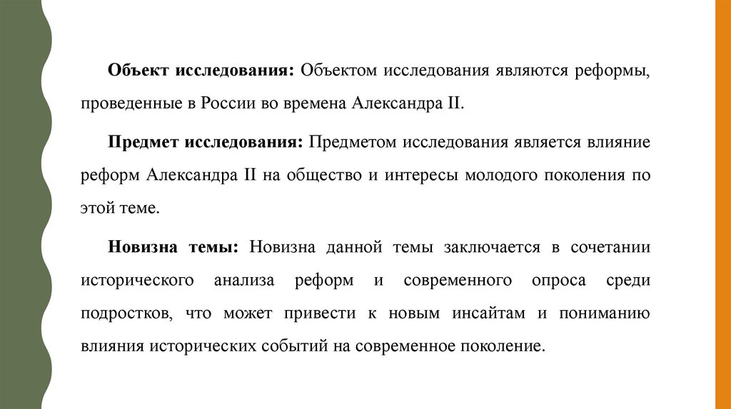 Объект исследования: Объектом исследования являются реформы,проведенные в России во времена Александра II.
