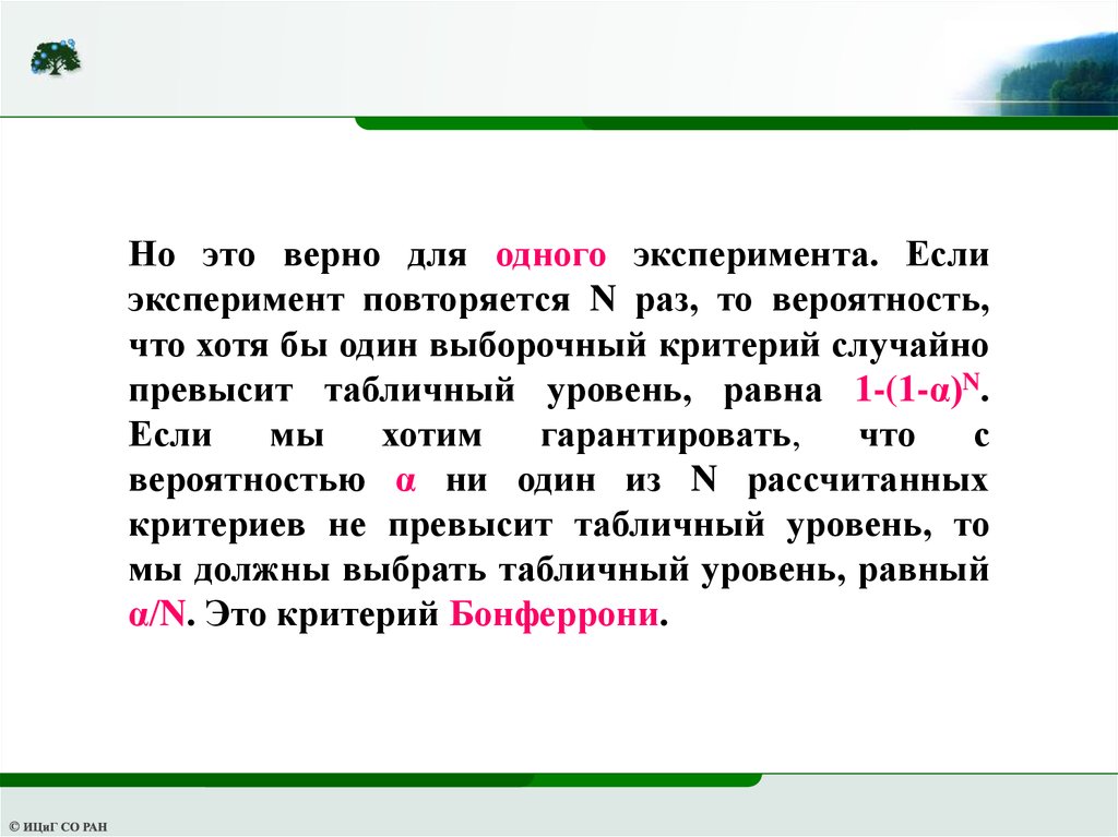 Этот критерий слишком жесткий. Если,например, α= 0.05 и N= 106, то p= α/N= 5∙10-8