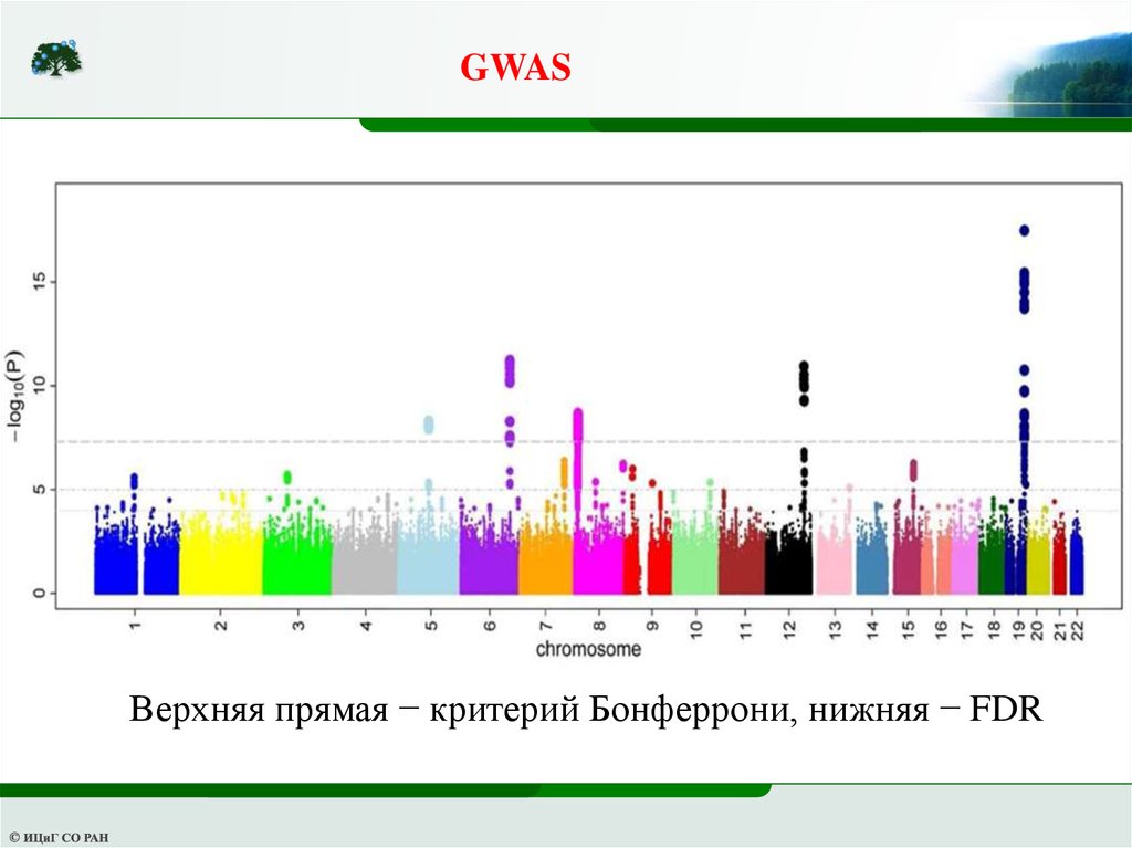 GWASВерхняя прямая − критерий Бонферрони, нижняя − FDR