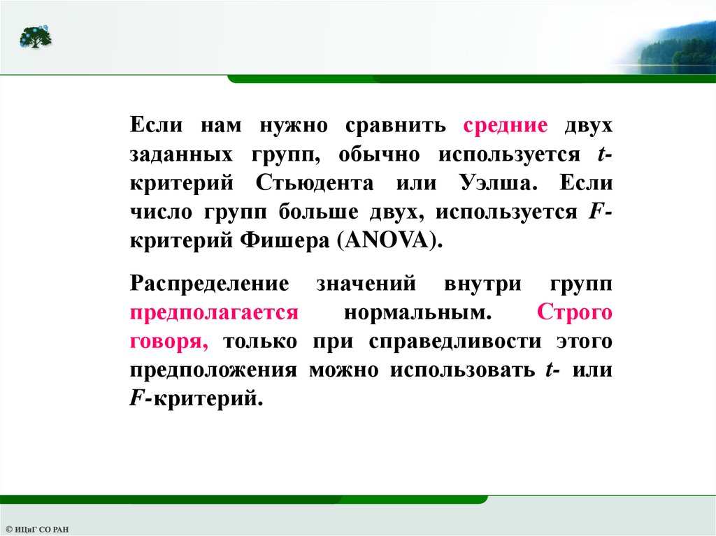число групп больше двух, используется Fкритерий Фишера (ANOVA).