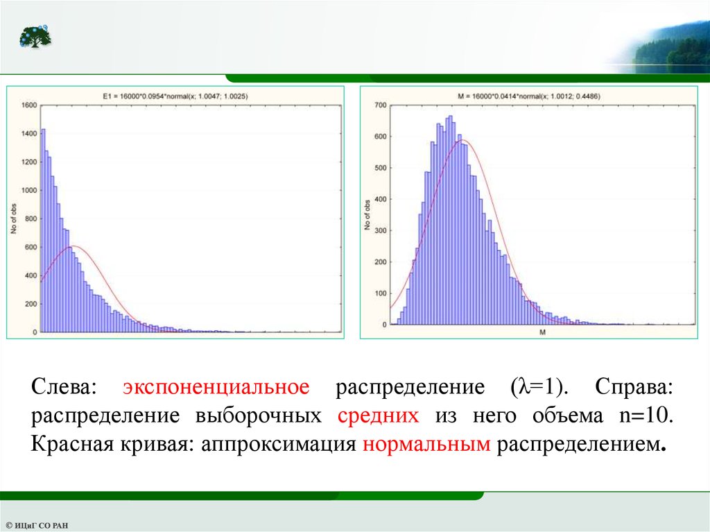 Слева: экспоненциальное распределение (λ=1). Справа:распределение выборочных средних из него объема n=10.