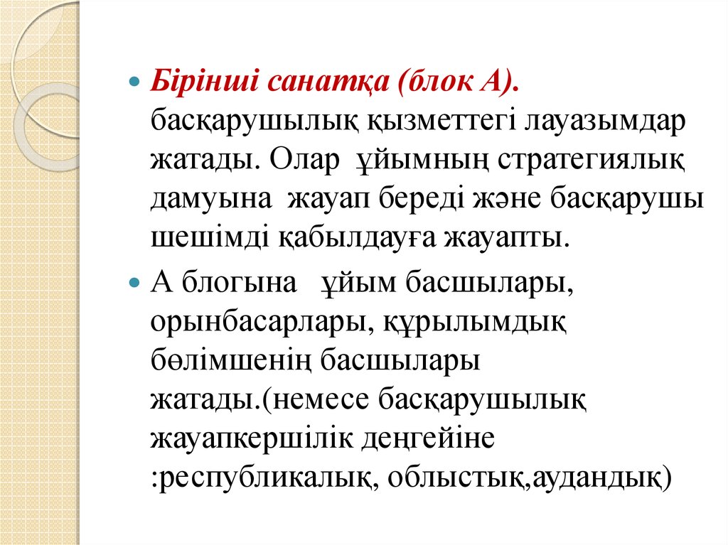 Бірінші санатқа (блок А).басқарушылық қызметтегі лауазымдар