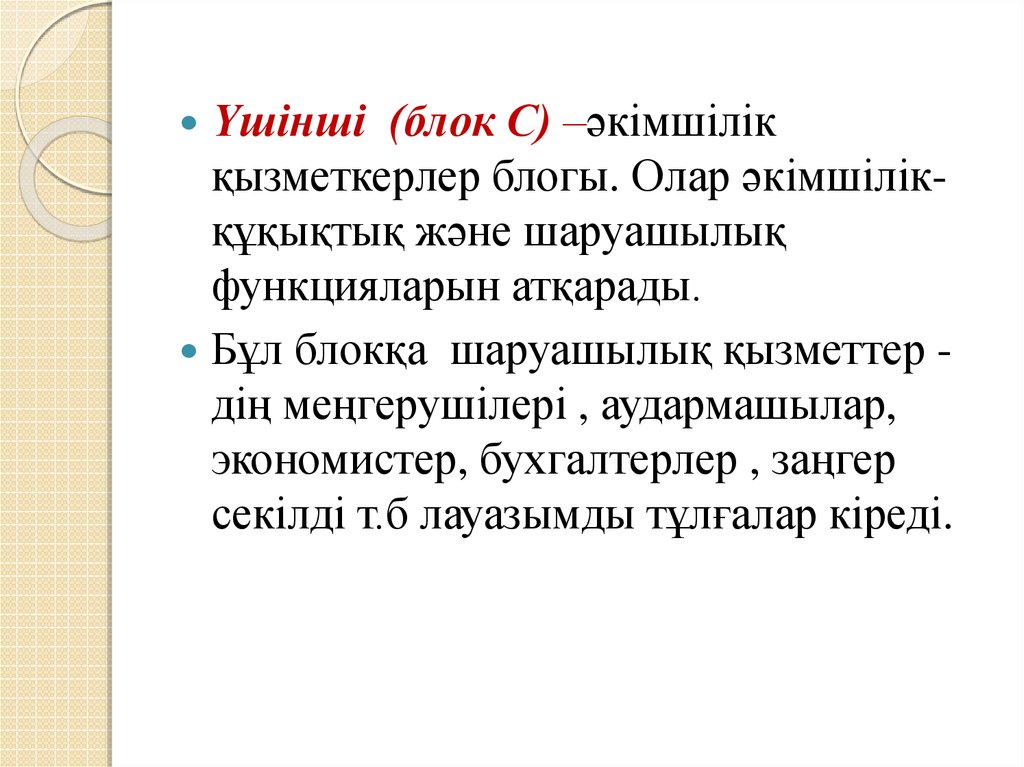 Үшінші (блок С) –әкімшілікқызметкерлер блогы. Олар әкімшілікқұқықтық және шаруашылық
