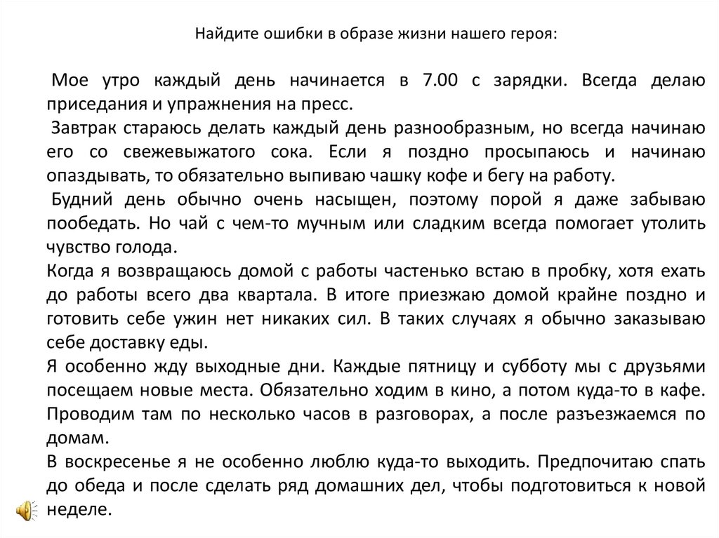 Найдите ошибки в образе жизни нашего героя:Мое утро каждый день начинается в 7.00 с зарядки. Всегда делаю