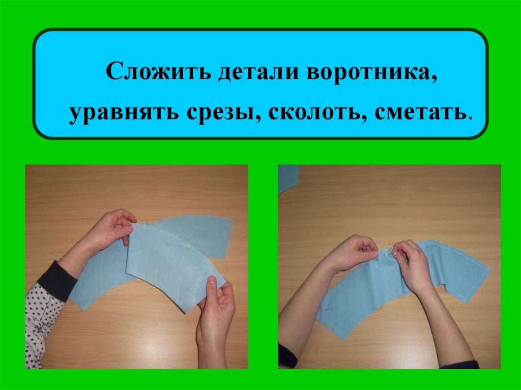 Сложить детали воротника,уравнять срезы, сколоть, сметать.