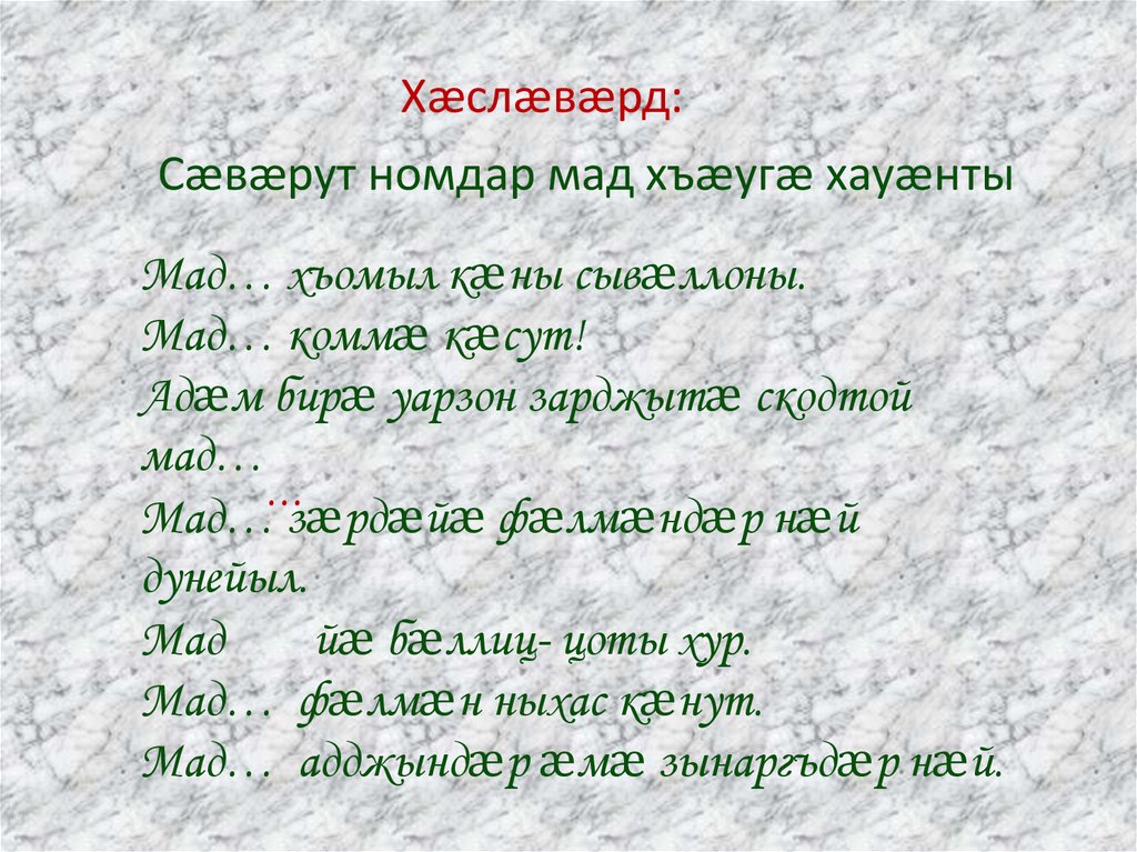 Мады зæрдæ у уарзты суадон. Мады рæвдыд у